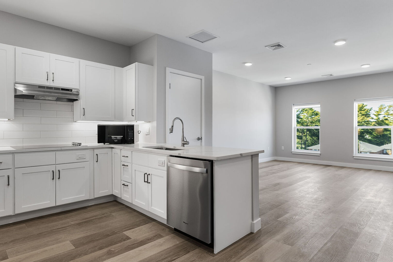 Welcome to Mill Street Heights, a thoughtfully designed new apartment community in one of Woburn's most charming residential areas. These modern homes offer the perfect blend of comfort, style, and convenience. Each apartment features oversized windows that fill the space with abundant natural light, highlighting the sleek wood-style flooring and warm, neutral color palette. The interiors balance earthy tones with clean white finishes for a bright yet cozy feel, while recessed lighting adds a modern touch throughout.